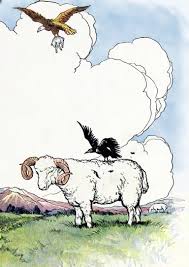 La vio un cuervo y tratando de imitar al águila, se lanzó sobre un carnero, pero con tan mal conocimiento en el arte que sus garras se enredaron en la lana, y batiendo al máximo sus alas no logró soltarse.